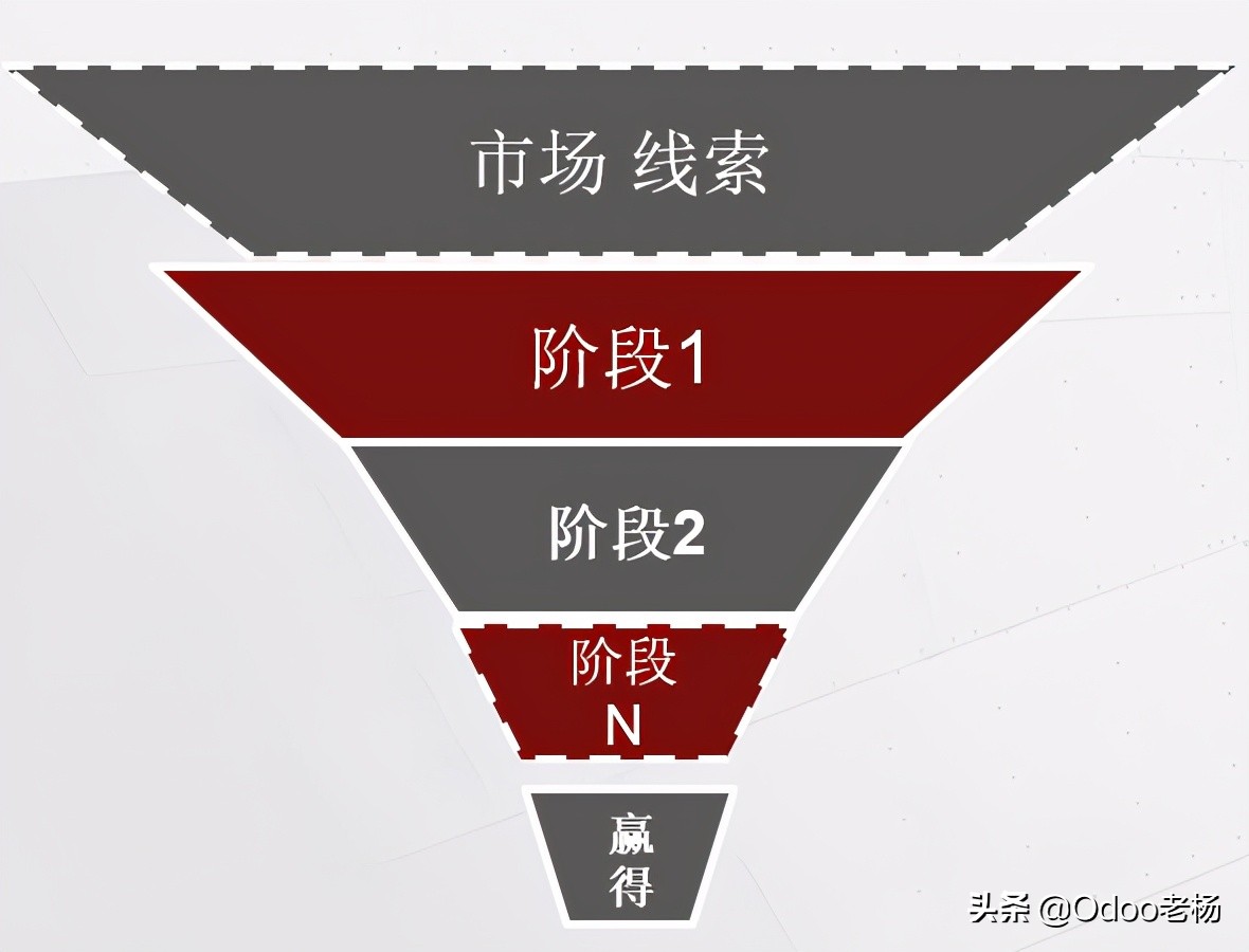 Odoo的CRM主要是To B的销售,常见的CRM软件通常讲的都是To B的销售,如SalesForce等。To B CRM客户关系管理的核心概念是销售漏斗,从市场上收集到各种潜在需求客户,或者说潜在商机,潜在商机到最后的成交,有一个商机的转换过程,把此过程定义成若干个阶段,比如说阶段一阶段二阶段三等等,经过若干个阶段逐步往下推进,最后一个阶段就是成交。这就是销售漏斗的概念,也是企业销售过程的科学管理。