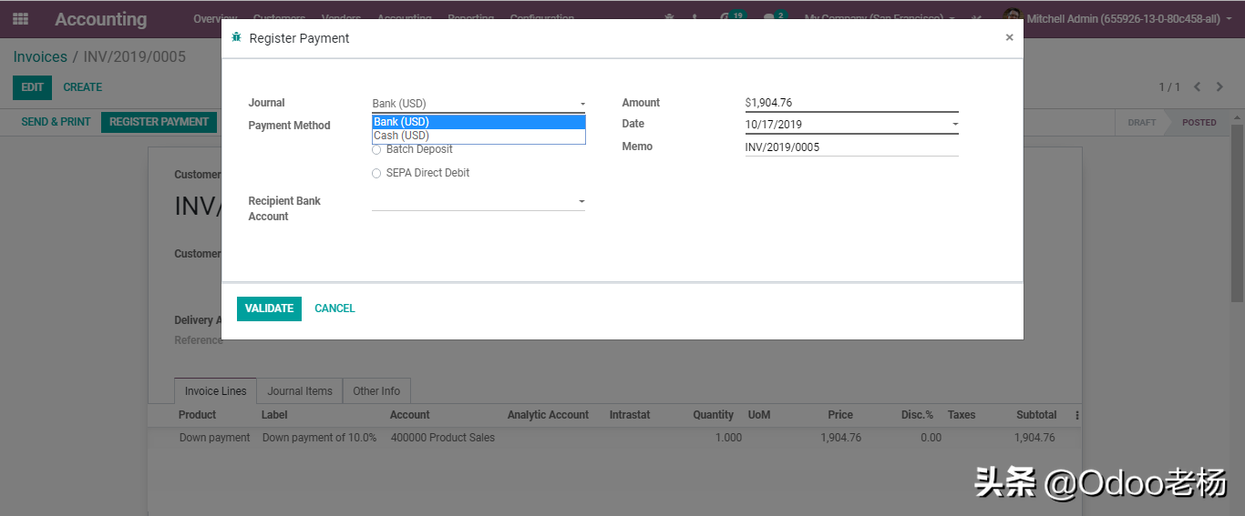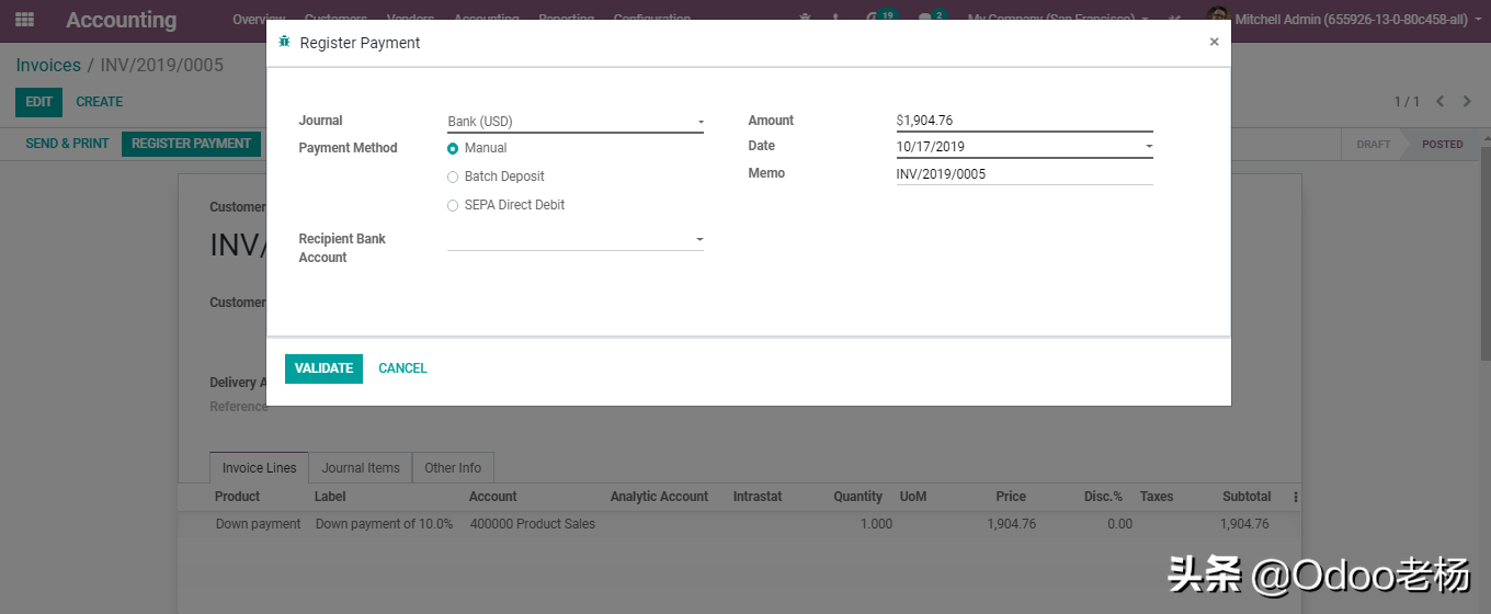 Odoo可以启用自动生成发票机制,确认在线支付后,发票生成将自动进行。