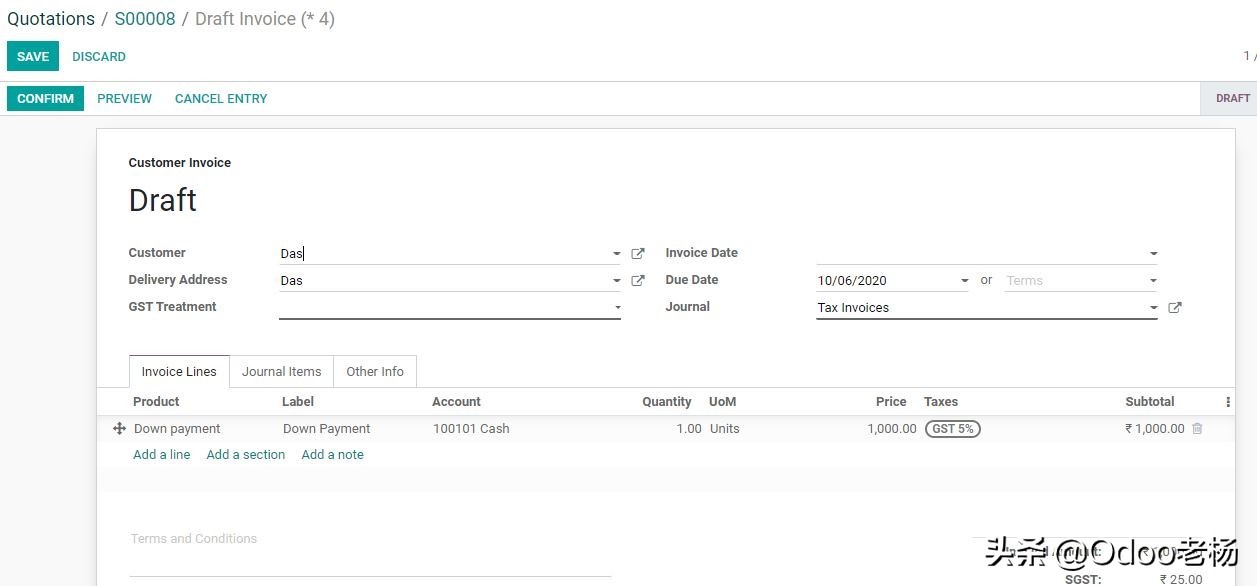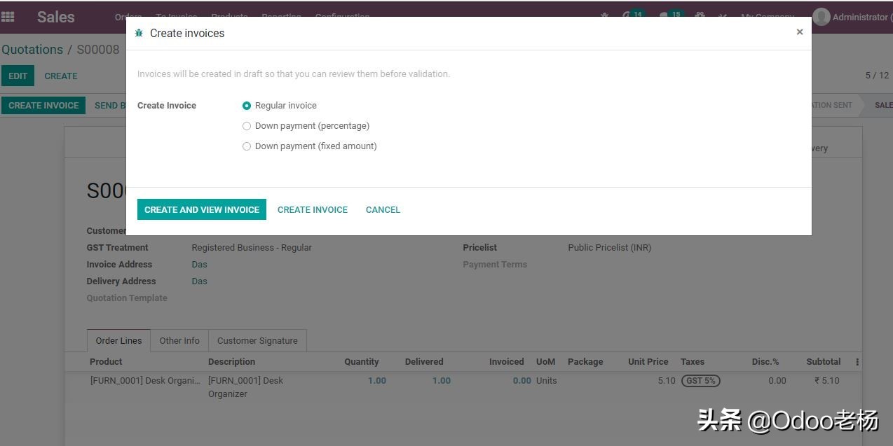 在Odoo中,默认模式是按订购数量开具发票,但是,交货数量发票可能对某些业务有利,例如,食品企业可以使用发票上的销售数量。用户可以在确认销售时看到已交付和已开票的数量。如果将发票策略设置为有序定量,则可以在确认销售后生成发票。