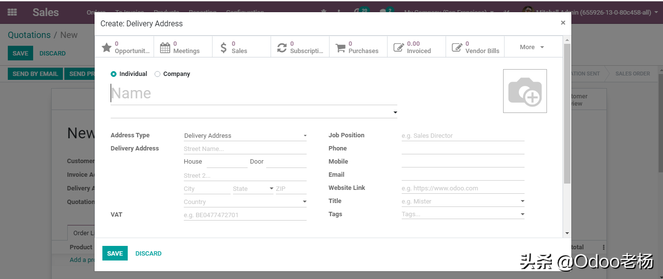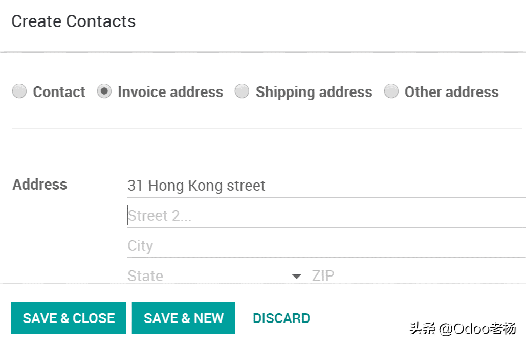 在创建联系人的情况下,您可以创建具有不同收货和发票地址的客户。Odoo将自动使用这些地址进行运输或交付。如果您只选择了一个地址用于使用,Odoo将自动选择相同的地址来生成和交付发票。但是,用户可以在创建报价单或销售订单时编辑地址。
