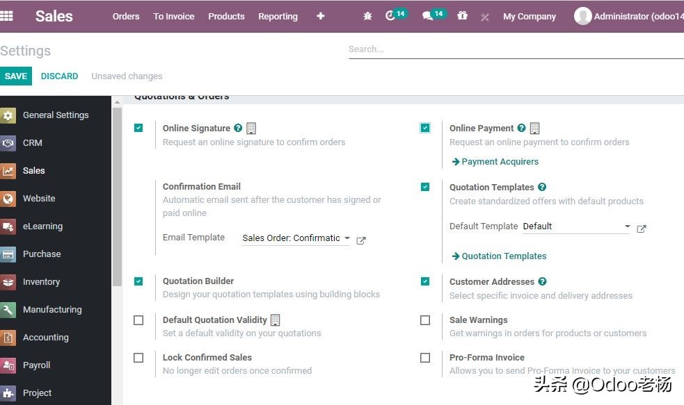 本文节选 Odoo亚太金牌服务·开源智造 老杨 所编写的《ERP真的免费不花钱(第三版)——Odoo14应用指南》第二章销售和发票功能应用篇之销售功能高级应用,本书籍持续创作连载中,请热心网友一键三连:点赞、转发、收藏,您的支持是我们最大的前进动力!