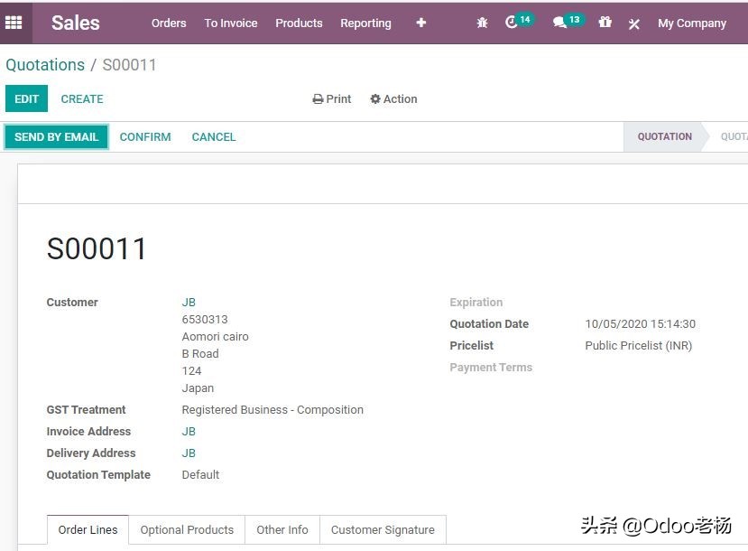 现在,让我们回到销售报价单。在这里,我们添加了所有字段,包括客户名称,产品,报价模板,价格表,付款条款,运输,优惠券和促销,现在我们可以将报价发送给客户。
