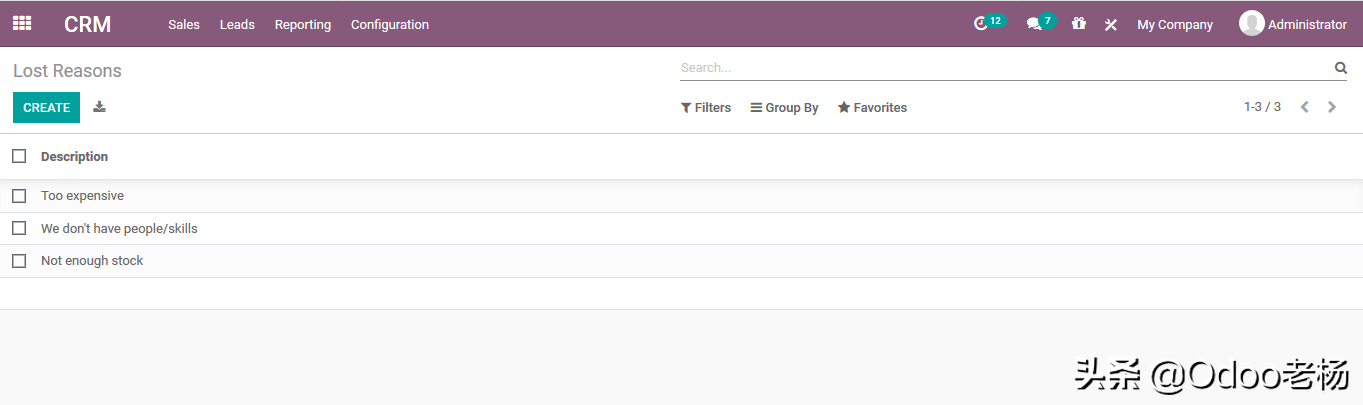 公司业务运行中商机的流失是一种业务常态情况,故此Odoo系统需要对流失的商机进行整体的信息管理。 用户可以在配置选项卡中的流失商机类型菜单下为流失的商机与客户分配各种丢失原因。流失商机类型用户可以自定义增加、修改、删除。